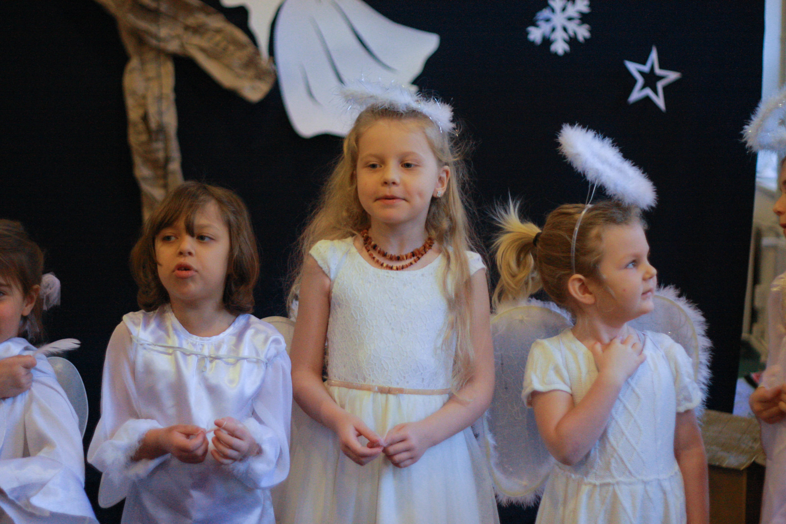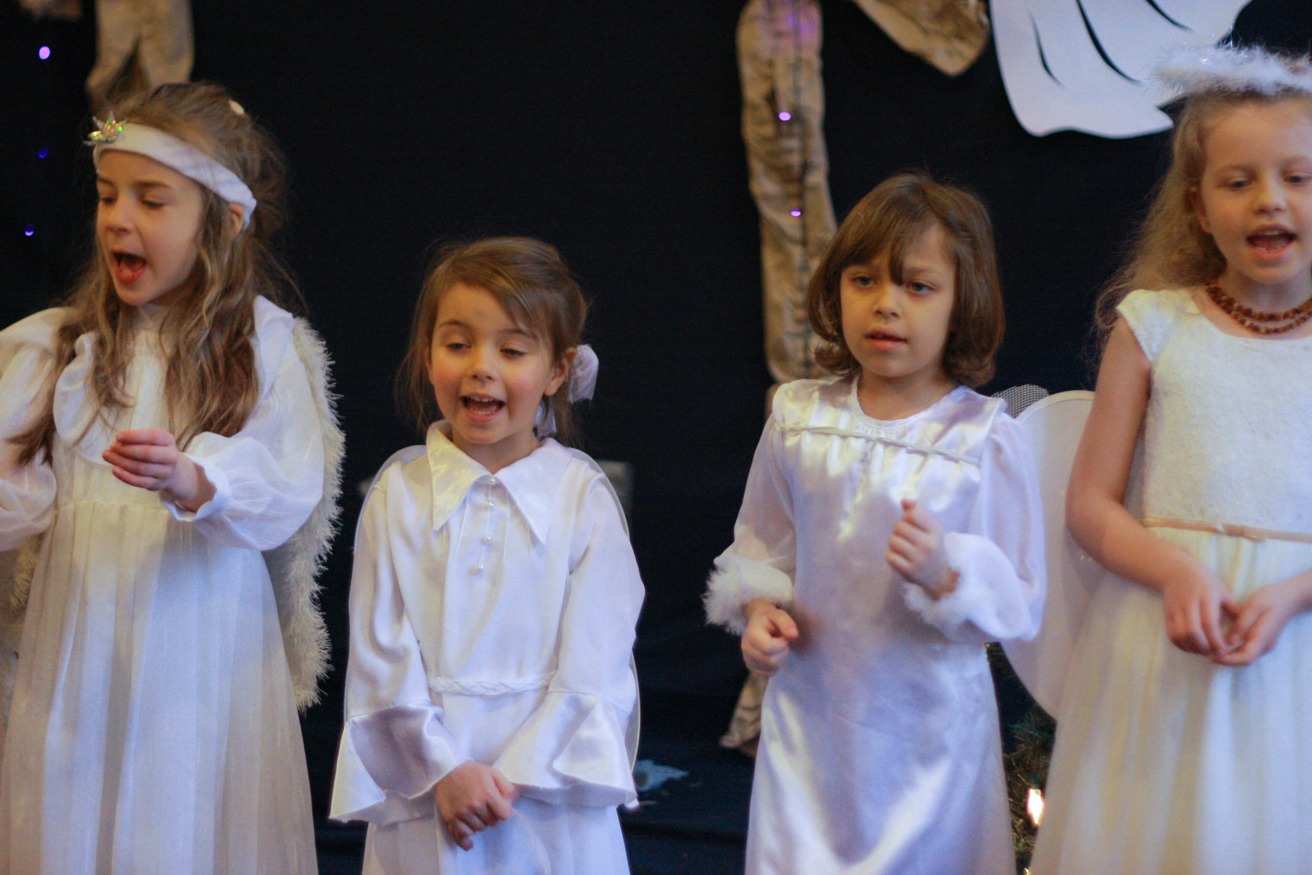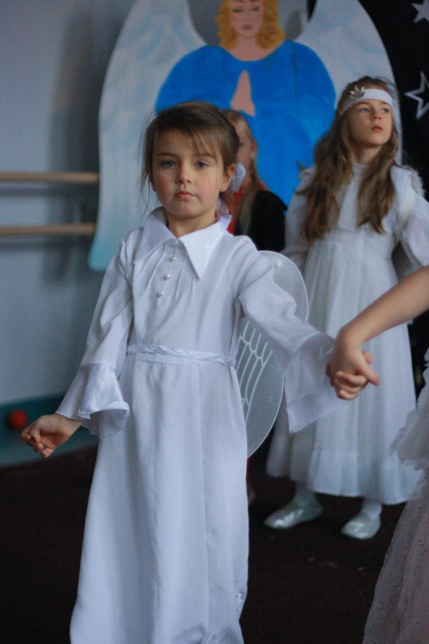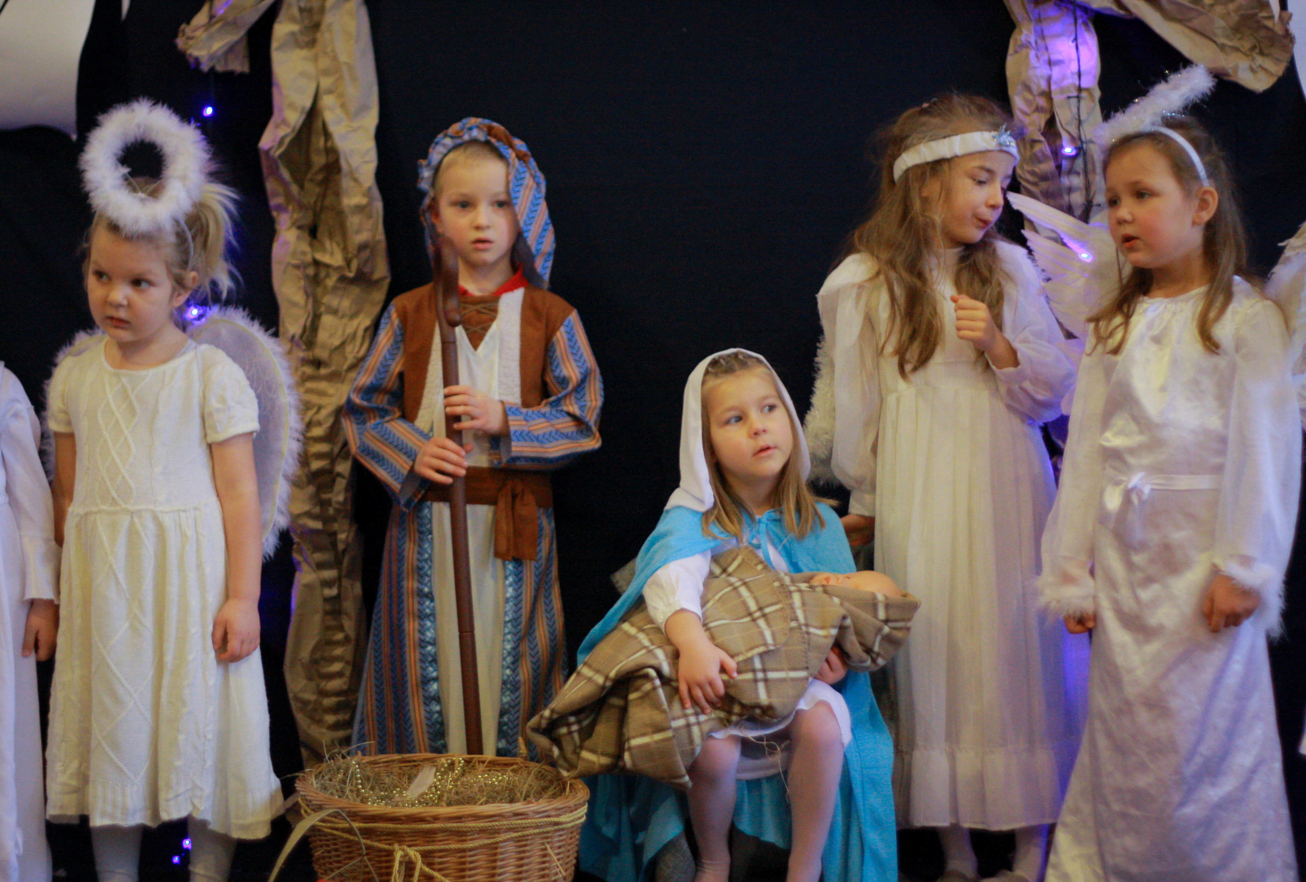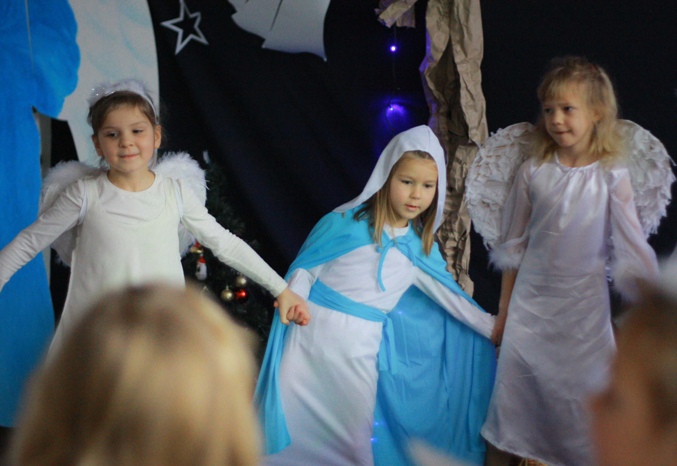 W piątek swoje pięć minut miały Muszelki. Mimo że grupa aktorów była zdziesiątkowana, przedstawienie było ujmujące. Józef i Maryja ze stoickim spokojem opiekowali się swoim małym Dzieciątkiem, najmłodszy przedstawiciel Trzech Króli (był tylko jeden, ale za to jaki!) bezbłędnie wyrecytował swoją kwestię, pastuszkowie złożyli pokłon, a chór – a właściwie chórek – anielski uświetnił to wszystko swoim śpiewem i obecnością ? Na koniec, pobrzękując janczarkami i podrygując zaśpiewały kolędę. Rozbrajające!