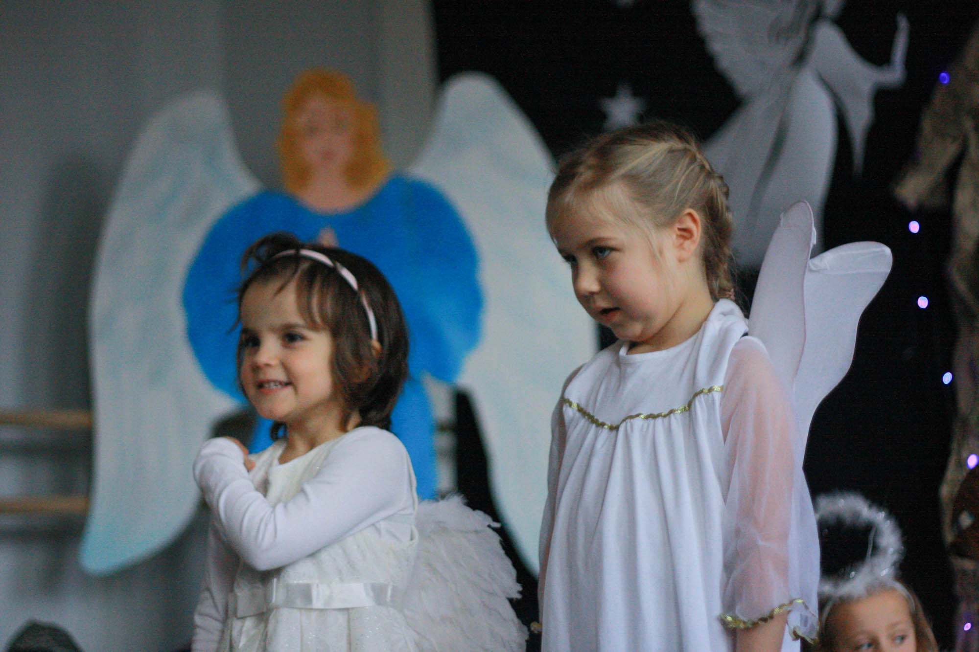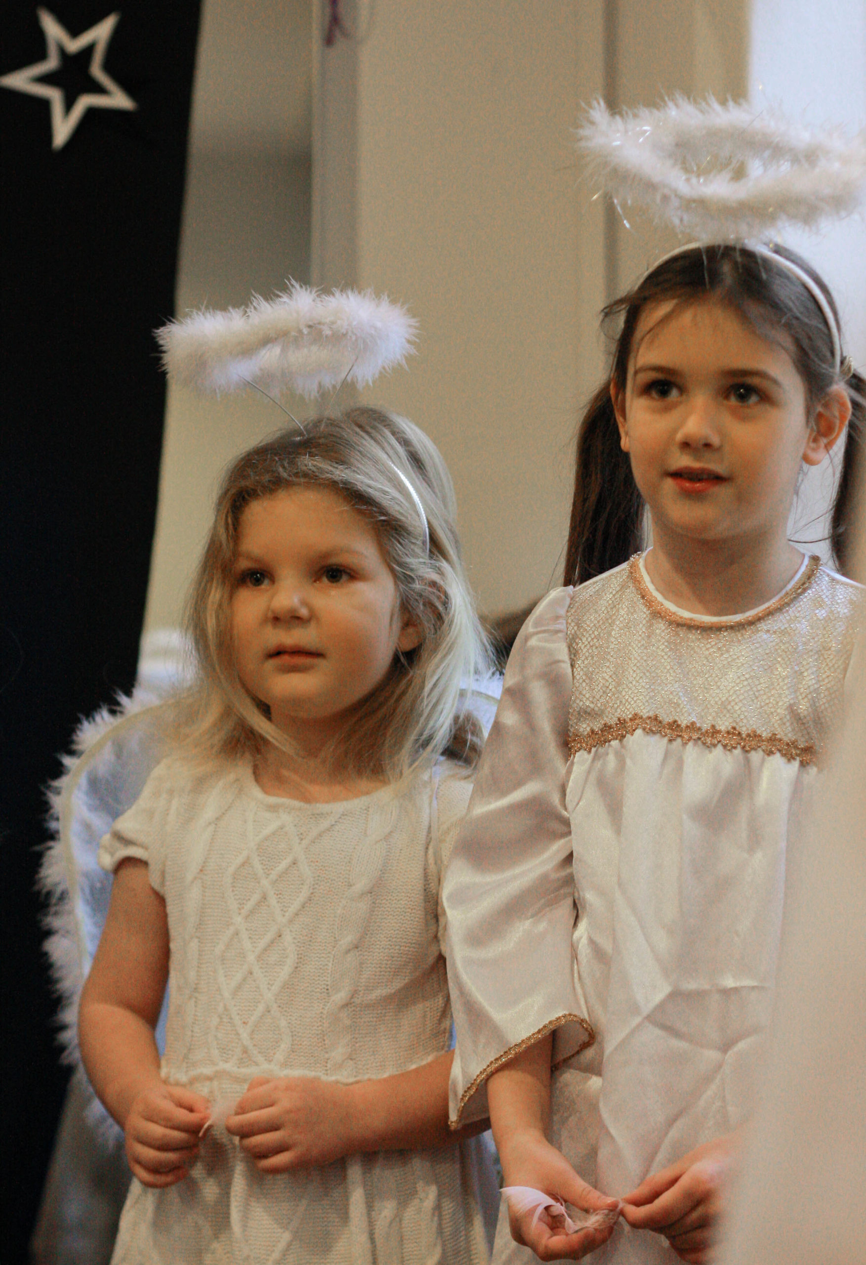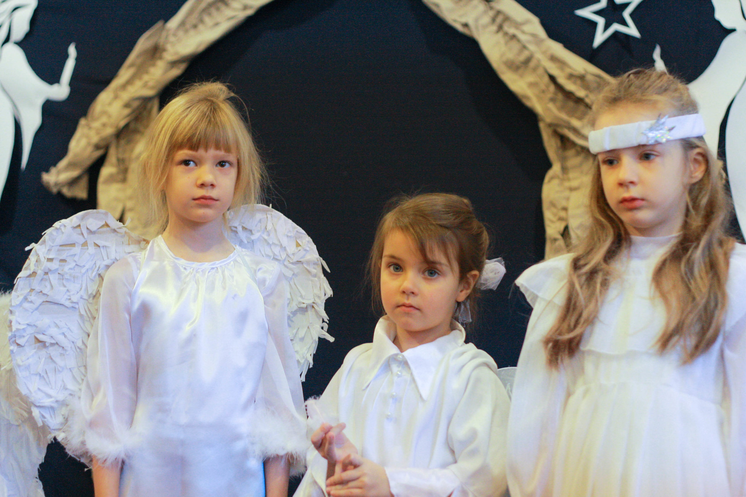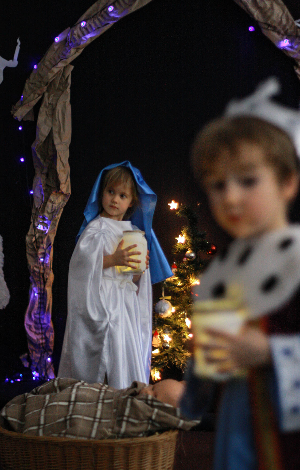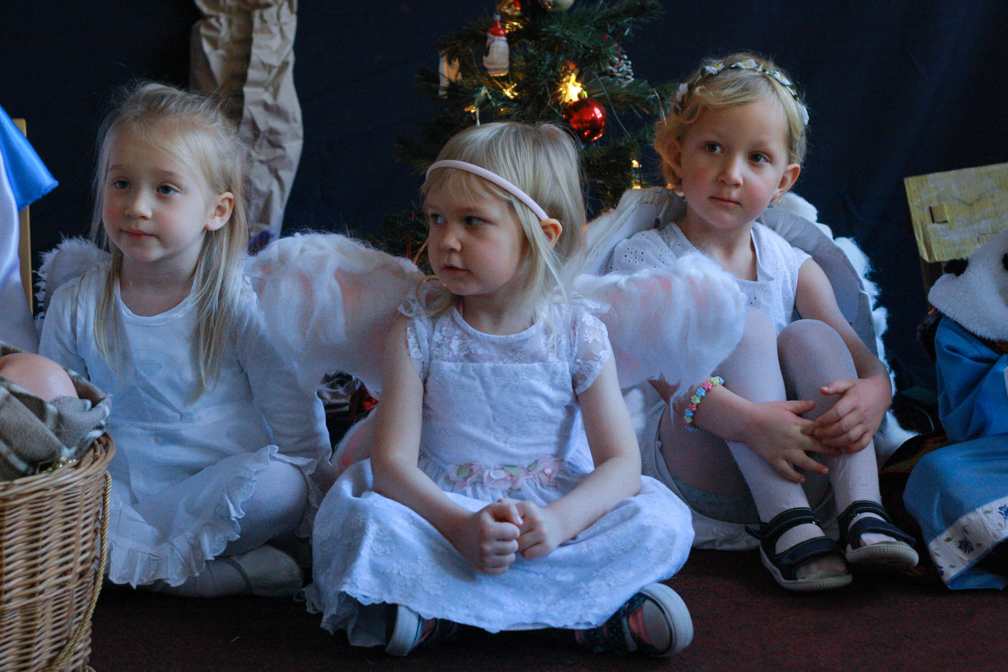 W piątek swoje pięć minut miały Muszelki. Mimo że grupa aktorów była zdziesiątkowana, przedstawienie było ujmujące. Józef i Maryja ze stoickim spokojem opiekowali się swoim małym Dzieciątkiem, najmłodszy przedstawiciel Trzech Króli (był tylko jeden, ale za to jaki!) bezbłędnie wyrecytował swoją kwestię, pastuszkowie złożyli pokłon, a chór – a właściwie chórek – anielski uświetnił to wszystko swoim śpiewem i obecnością ? Na koniec, pobrzękując janczarkami i podrygując zaśpiewały kolędę. Rozbrajające!