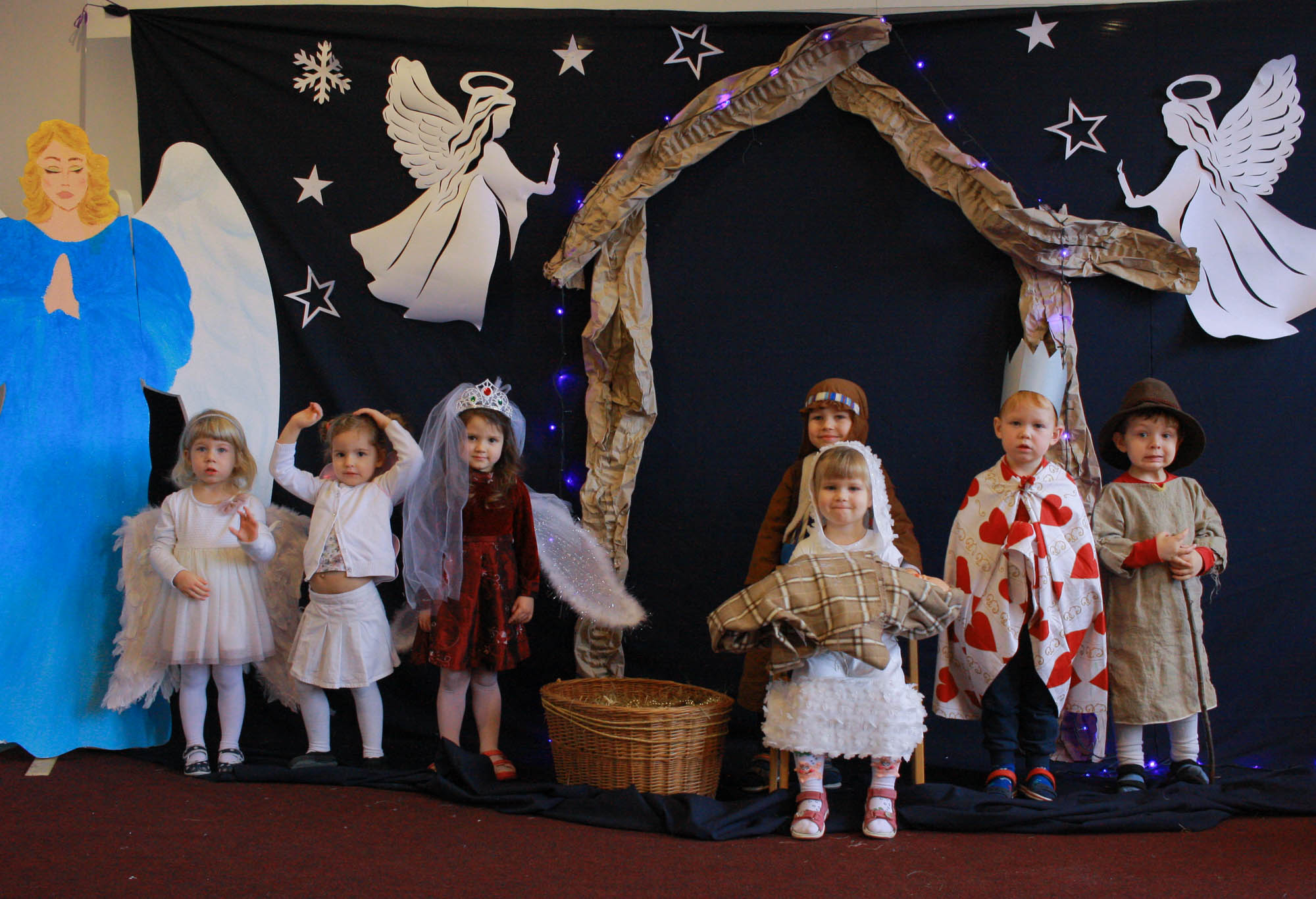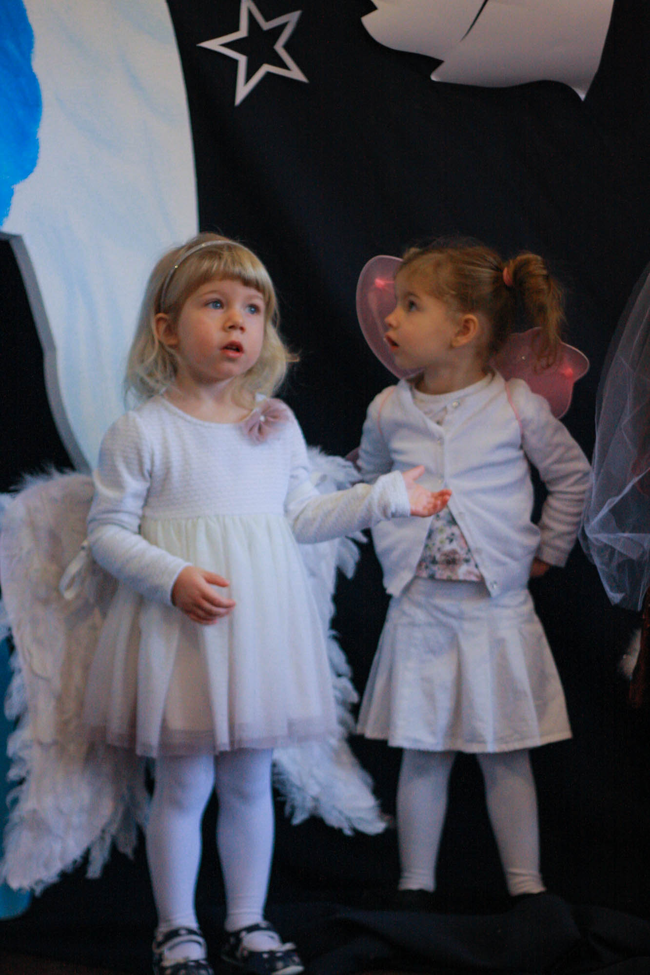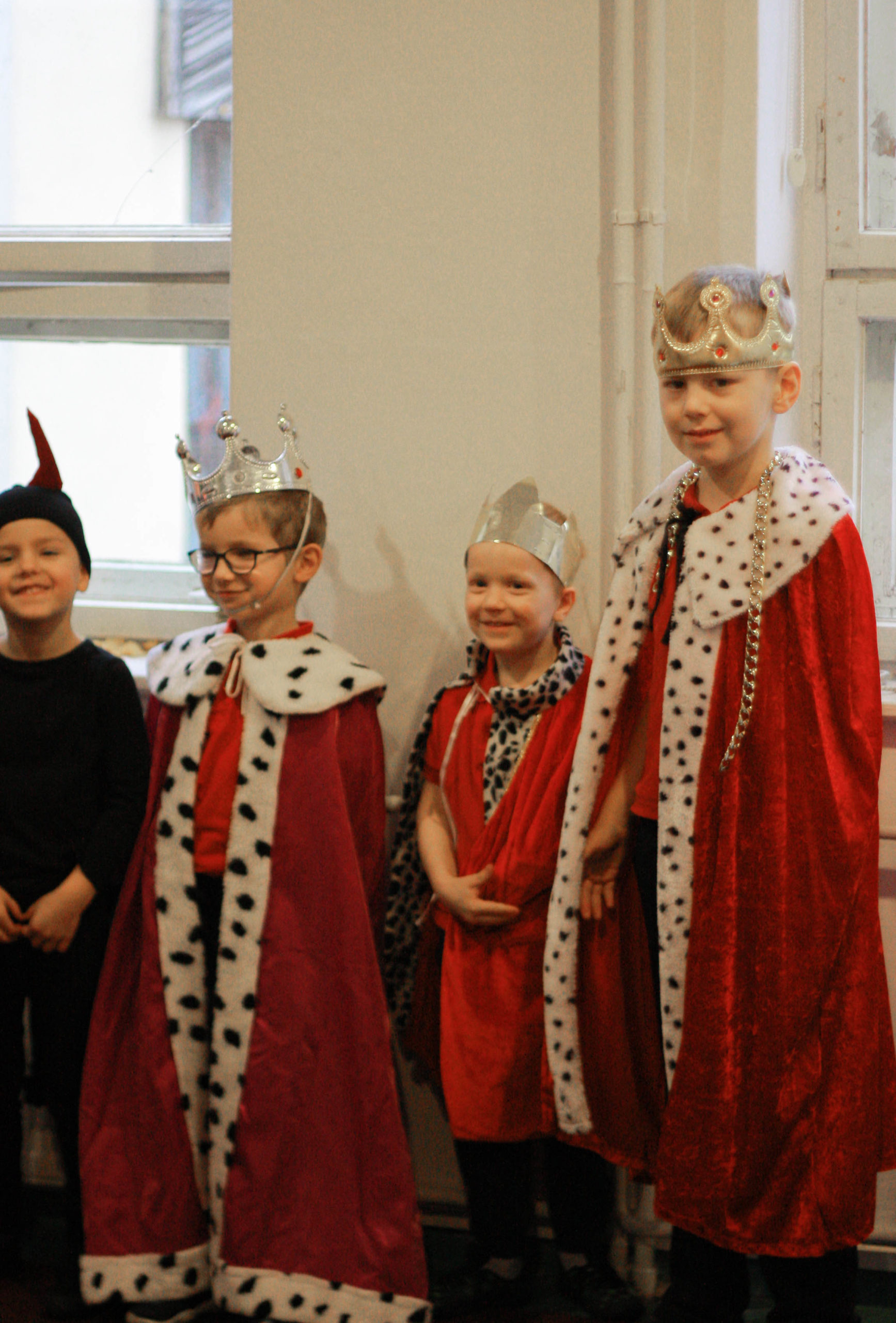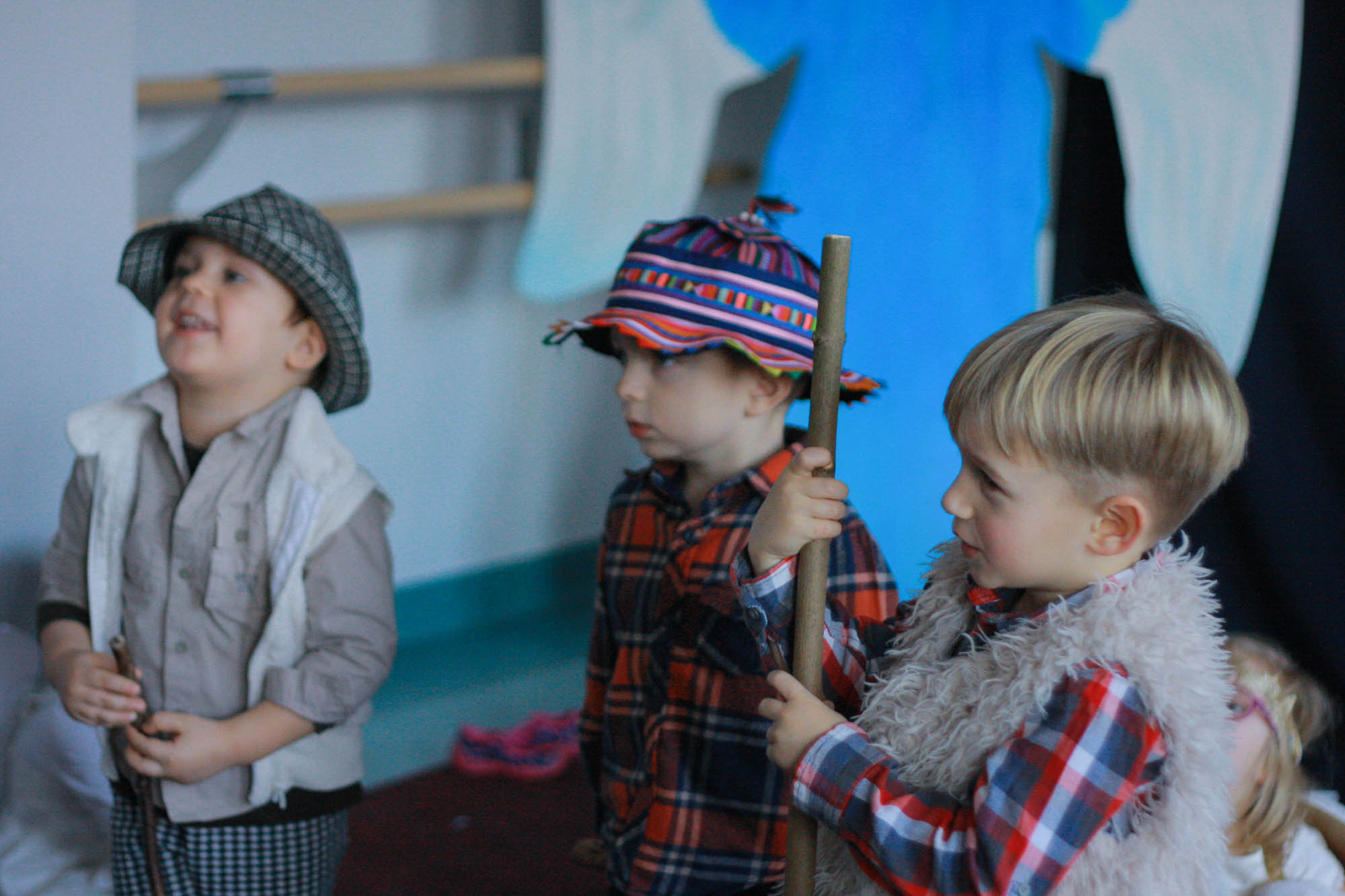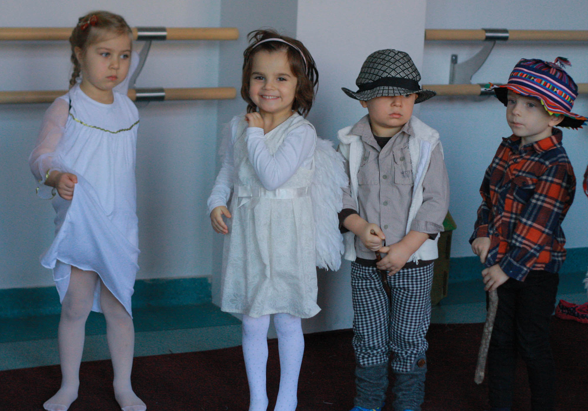 Jako ostatnie występowały Delfinki. To było dopiero coś! Trzej Królowie już w garderobie byli bardzo podekscytowani opowiadając o swoich drogocennych skarbach (słyszałam coś złotym wisiorze ze smokiem!), koronach i darach dla nowonarodzonego. Maryja tuląca Jezuska była zamyślona i tajemniczo uśmiechnięta, Józef – „pożyczony” z grupy Muszelek – znakomicie odnalazł się na gościnnych występach w starszej grupie (naturalny talent!).